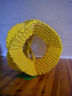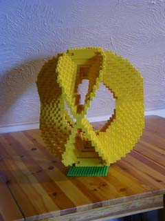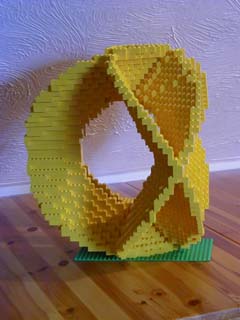 As with most of my mathematical surfaces, I made use of some computer assistance. Just in case anyone's interested, here's the raw LDRAW .DAT file generated by my program for this sculpture. Beware - the .DAT file builds it out of 1x1 bricks. Actually constructing this out of larger bricks so that it holds together is a (non-trivial) exercise for the reader!