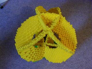 and the model shows this parametrisation for 0 < t < 4p, 1 < r < 4. There's no particular mathematical reason for taking the image of an annulus like this rather than a disk, but the hole left in the center lets you see the structure better. And anyway, it makes building it more of a challenge and looks cool...