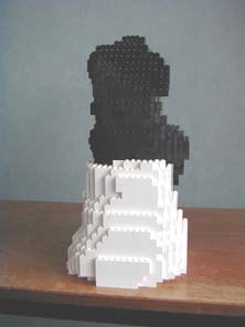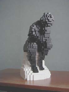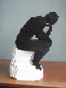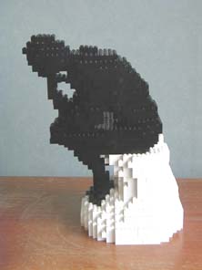 Although I built my LEGO Dilbert character sculptures entirely by eye from books of comic strips, I did not attempt this with the Thinker. The first cut was generated by using photographs of a small rendition of Rodin's work, taken from various angles, which I found on the web. I hand-hacked the photographs into sillouettes, and wrote some C code (actually loosely adapted from the programs I used to produce my mathematical LEGO sculptures) to use the sillouettes to cut away at a notional block of 1x1x1 LEGO bricks and produce a .DAT file for what was left (With more than two photographs, taken from unspecified angles, this is a bit fiddlier than it sounds). The result was pretty grotty around the legs, so I hand-hacked the photographs some more to remove the rock , and produce sillouettes (and hence a .DAT file) of just the figure. Then I laboriously removed the figure from the pictures and ran my code again to produce a .DAT file of the rock (no, you can't have them; they look terrible). The result was still pretty rough around the legs, and awful around the front of the torso and the arms, but I edited fairly broadly by eye as I built the first version. Then I built a second one from the first, editing by eye again. After a third pass, and a week after seriously starting the project (I've been vaguely thinking about it for months) I finally produced the sculpture in the pictures. I'm still not completely happy - the legs are a bit too bulky, and the left arm needs more work - but I don't think I'll be making further alterations unless I disassemble it to produce a .DAT file of the final construction.